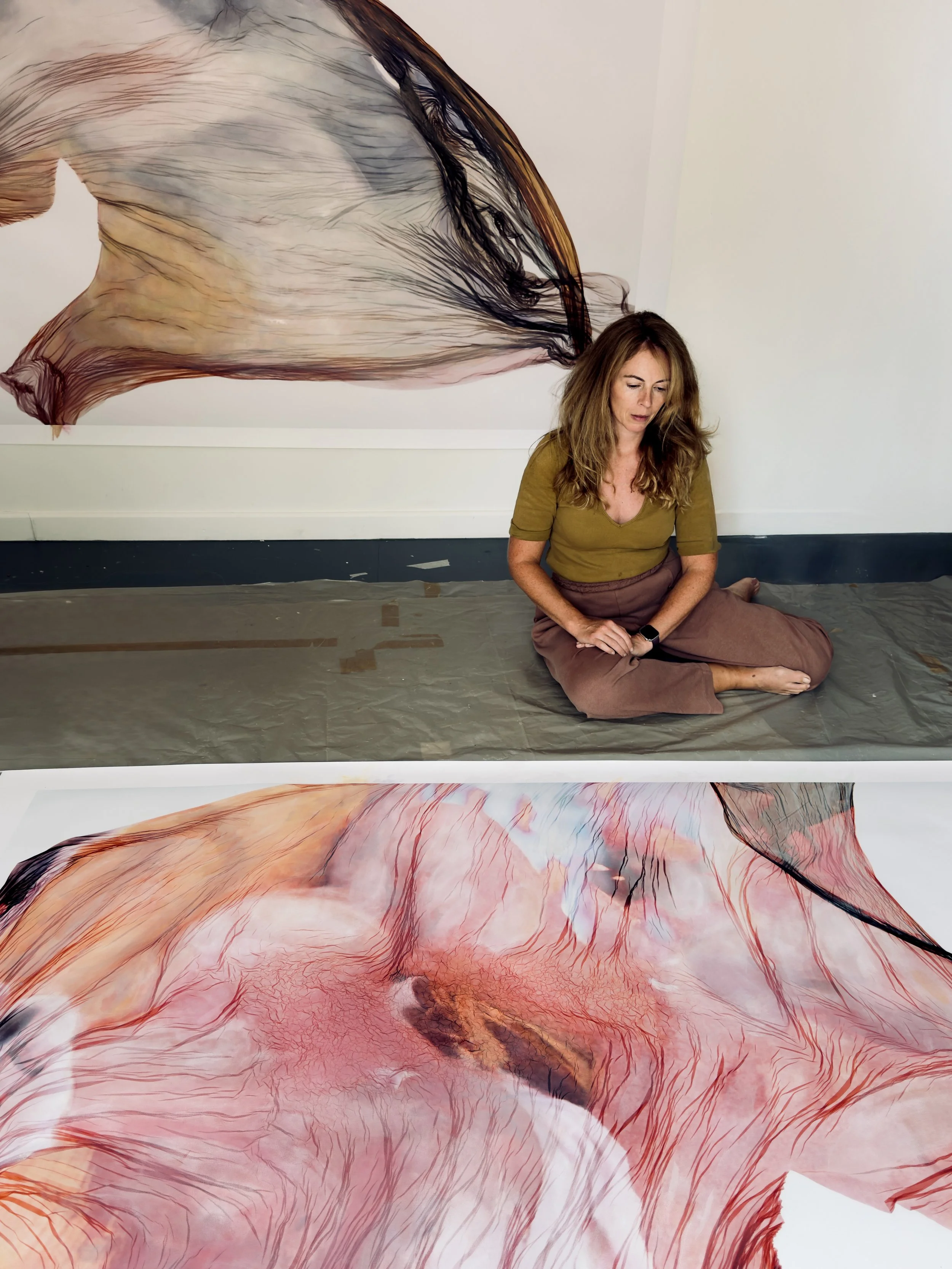 Erin Bird (b. 1978) is a UK-based American artist, known for her distinctive “waterprinting” technique—a hybrid process that merges photographic imagery with painterly abstraction through the elemental force of water. Born to Irish immigrants in Upstate New York, Bird’s work navigates themes of memory, inherited trauma, and transformation, often rooted in her personal history of cultural dislocation and intergenerational silence.